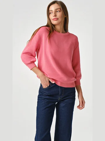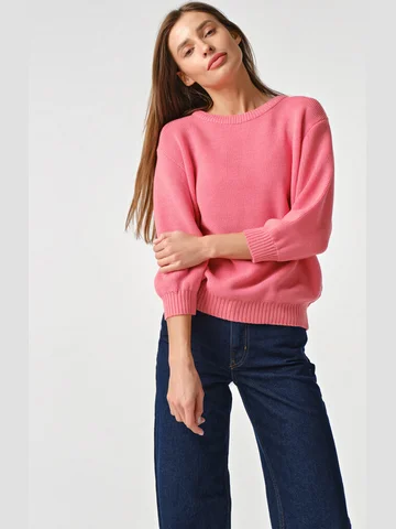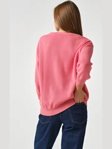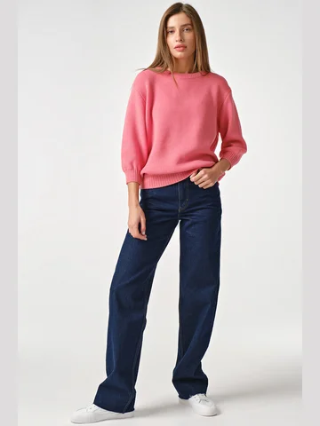 Длина изделия:65 смОсобенности: Вязаный джемпер с рукавами 3/4 на манжете. Низ изделия рукава воротник оформлены резинкой в рубчик.
